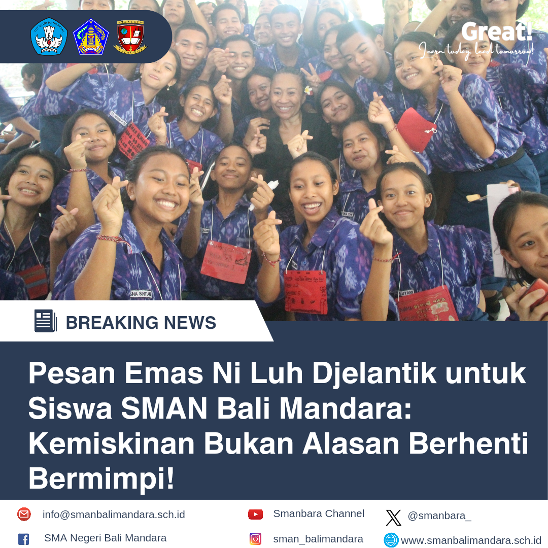Dalam sambutannya, Ni Luh Djelantik membagikan pandangan hidup penuh makna, menegaskan bahwa perjalanan dan perjuangan akan membawa hasil bila disertai keyakinan dan kerja keras. Sebelum meninggalkan sekolah, ia menyampaikan pesan penting kepada para siswa: “Kemiskinan tidak boleh menjadi alasan untuk berhenti bermimpi. Ketika sukses, jangan lupa kembali ke rumah yang membentukmu.” Pesan tersebut mengingatkan pentingnya kerendahan hati dan rasa syukur dalam meraih cita-cita.
