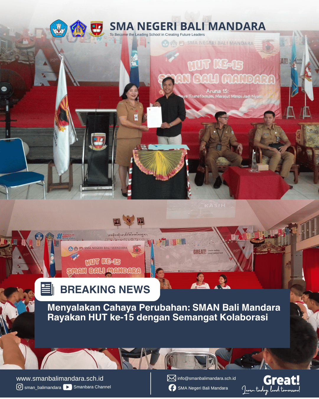 Menapaki usia ke-15, SMA Negeri Bali Mandara (Smanbara) kembali menegaskan posisinya sebagai institusi pendidikan yang progresif dan berkarakter. Mengusung tema besar “Aruna 15: Cahaya Transformasi, Merajut Mimpi Jadi Nyata”, rangkaian perayaan hari ulang tahun (HUT) sekolah ini resmi dibuka pada Senin (6/4) dengan serangkaian agenda yang memadukan refleksi mendalam dan penguatan kompetensi siswa. Kegiatan hari pertama diawali dengan suasana khidmat melalui sesi “Refleksi HUT ke-15 Smanbara”. Seluruh warga sekolah diajak untuk merenungkan kontribusi nyata mereka melalui tajuk “Apa yang telah kuberi untuk Smanbara?”. Sesi ini menjadi pengingat bahwa kejayaan sekolah merupakan hasil dari dedikasi kolektif antara guru, siswa, dan staf. Momentum ini diperkuat dengan agenda strategis berupa penandatanganan dan penyerahan SK Kepengurusan Ikatan Alumni (IKA) Suryambara, yang menandai penguatan sinergi antara sekolah dan para alumni sebagai pilar pendukung kemajuan institusi. Acara dibuka secara resmi oleh Kepala SMAN Bali Mandara, Ibu Ni Made Sri Narawati, S.Pd., M.Pd. Dalam sambutannya, beliau menekankan bahwa usia 15 tahun adalah fase krusial untuk melakukan transformasi berkelanjutan demi mencetak pemimpin masa depan yang tangguh. Sejalan dengan semangat tersebut, Ketua Panitia Pelaksana, Ibu Ayuk Ratna Puspaningsih, S.Pd., M.Pd., menjelaskan bahwa peringatan tahun ini dirancang untuk menyentuh berbagai aspek pengembangan potensi siswa.